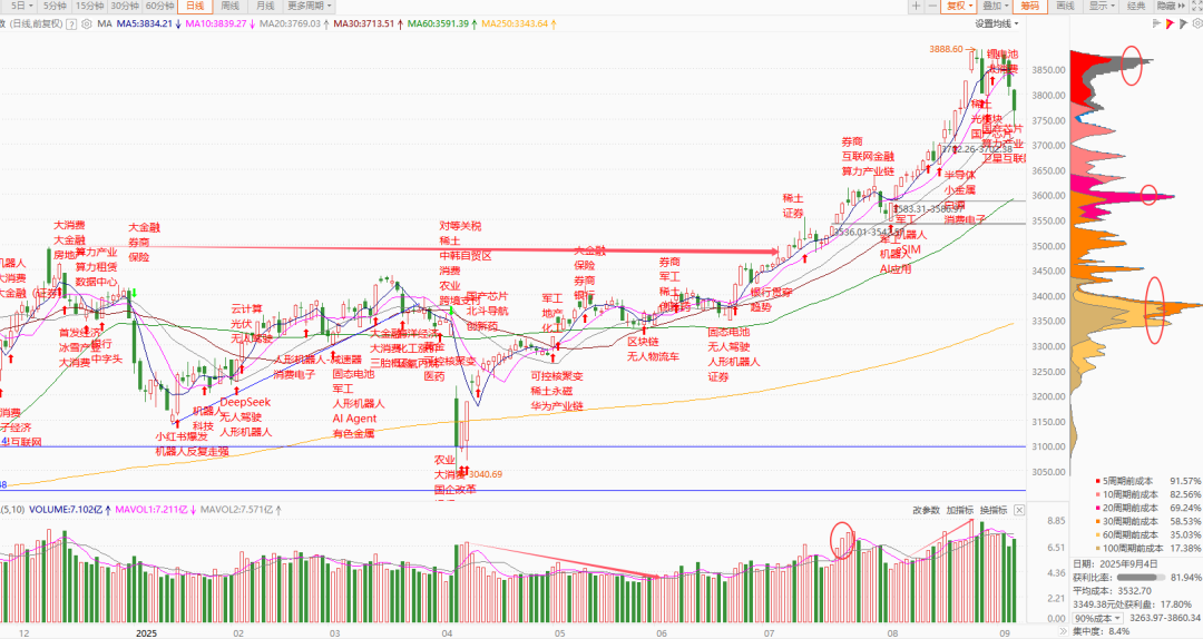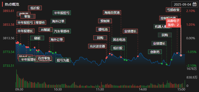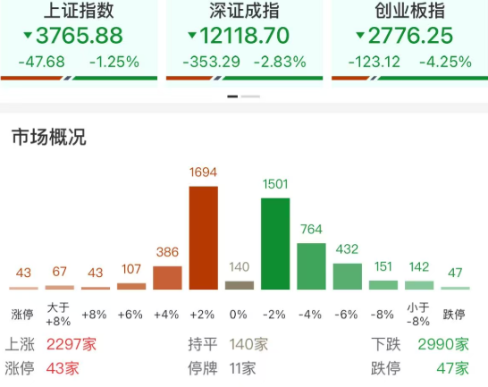 2025年9月4日,市场全天震荡走低,创业板指领跌,科创50指数跌超6%。上证指数跌幅1.25%,报收3765.88点,深证成指跌幅2.83%,报收12118.70点,创业板指跌幅4.25%,报收2776.25点。