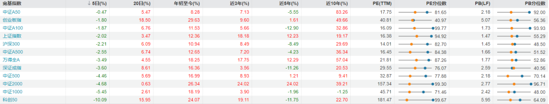 周四各大指数涨跌不一,百分位、估值出现不同程度变化,可以作为参考因子,当分位点达到高点,可以辅助短期操作进行高抛,当分位点调整至低点,可以辅助短期操作进行低吸。中期可以在低估点位,逐步开始定投。(蓝色当前,黄色是平均)。数据来源:Wind