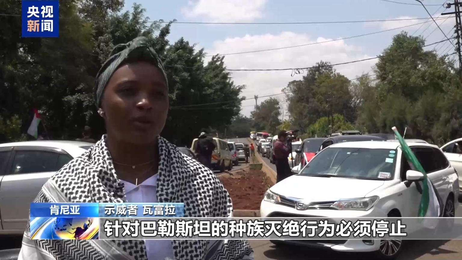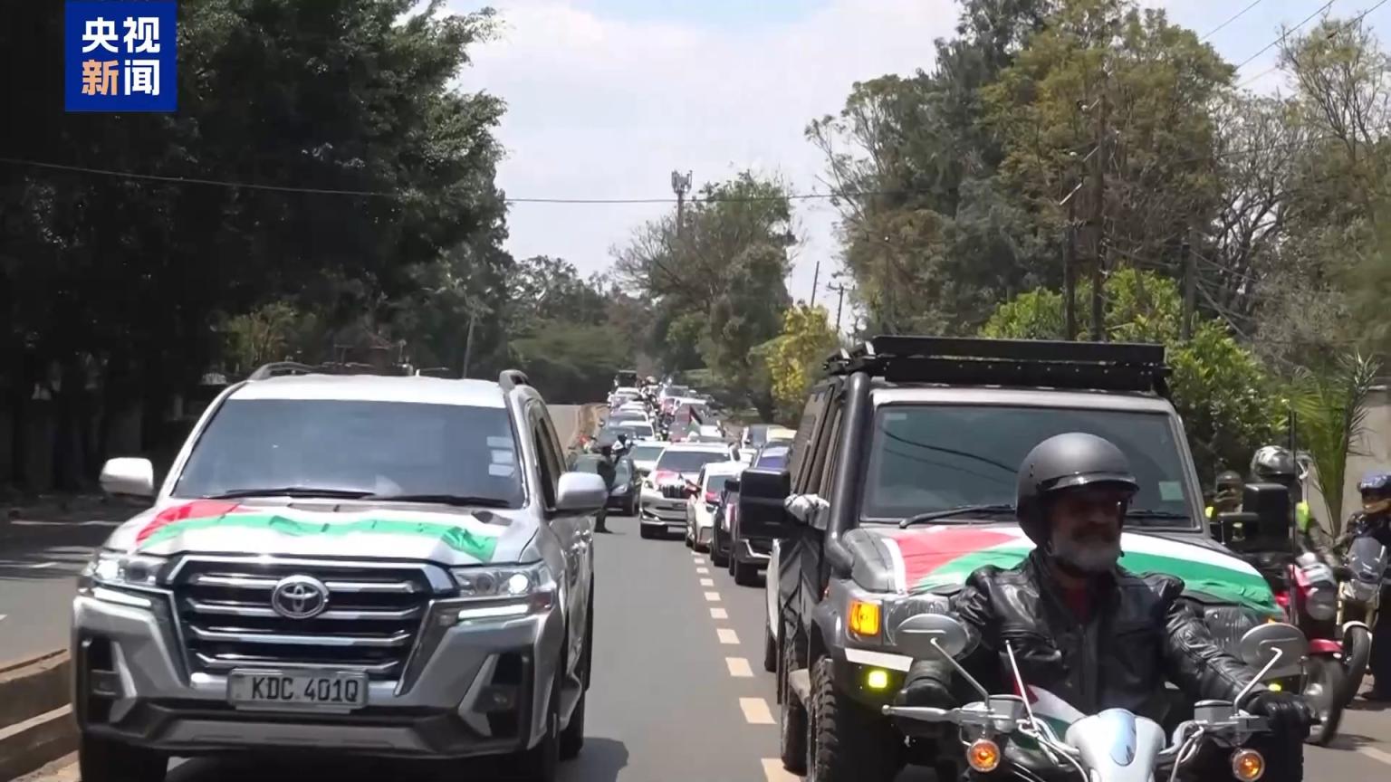 24日,在肯尼亚内罗毕,数百名示威民众骑着自行车、摩托车或驾驶汽车列队行驶在当地公路上。他们在车上悬挂着巴勒斯坦国旗,口中呼喊着声援加沙地带巴勒斯坦民众的口号,并要求以色列及其支持者停止在加沙的“种族灭绝”行动。